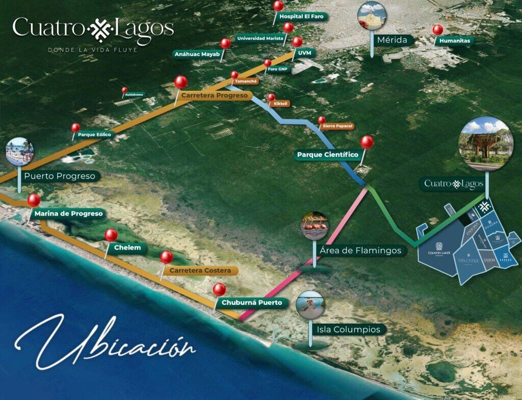 Ubicado en una zona de alta plusvalía y desarrollo, Cuatro Lagos se encuentra a solo 10 minutos de la playa y a 20 minutos de Mérida.